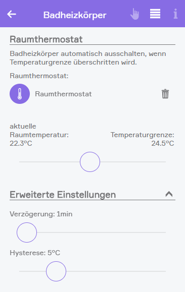 Damit es im Badezimmer nicht ungewollt zu warm wird, kann die Raumtemperatur mit dem Badheizkörper verknüpft und somit die Raumtemperatur begrenzt werden. Ist der Badheizkörper aktiv und wird die eingestellte Temperatur erreicht, schaltet sich der Badheizkörper automatisch aus.