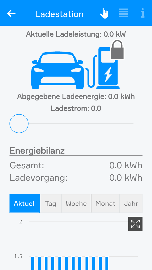 Im Operator Panel werden die wichtigsten Kennzahlen sowie der Status des Ladevorgangs angezeigt, darunter die aktuelle Ladeleistung, die abgegebene Ladeenergie und der aktuelle Ladestrom. Das Symbol des Autos und der Ladestation verändert sich mit dem Status des Ladevorgangs und des angeschlossenen Kabels: