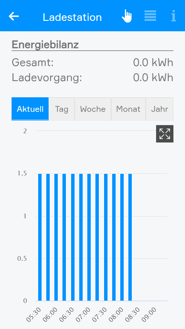Am Ende des Panels können Sie noch genauere Daten bezüglich des aktuellen Ladevorgangs für die einzelnen Phasen (nur wenn die Ladestation 3-phasig angeschlossen ist) und des gesamten Energiebedarfs seit der ersten Inbetriebnahme einsehen.