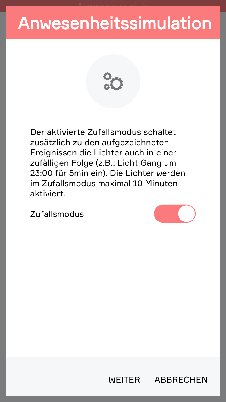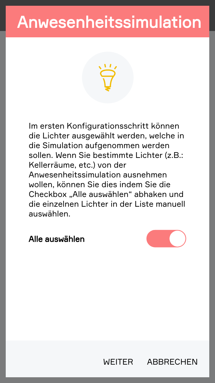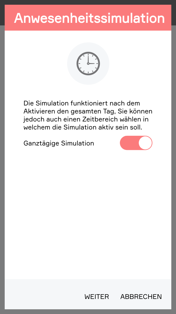 Die Anwesenheitssimulation soll trotz Abwesenheit (z.B.: Urlaub) das Eigenheim bewohnt aussehen lassen und somit als Schutz vor Einbruch dienen. Um die Anwesenheit bestmöglich zu simulieren wird das gewohnte Verhalten aufgezeichnet und lokal auf Ihrem Controller gespeichert. Diese Daten werden dann verwendet, um eine intelligente Simulation der Anwesenheit zu ermöglichen.