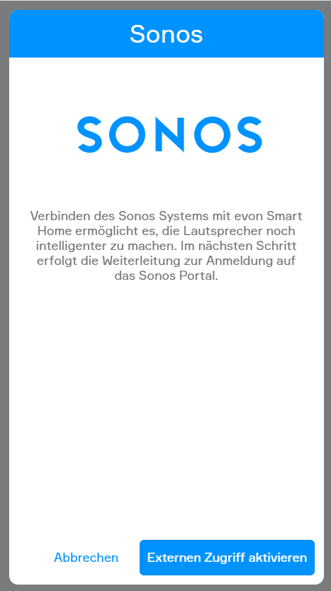ACHTUNG! Zum Verbinden mit Sonos muss der externe Zugriff aktiviert sein ("Einstellungen" > "Externer Zugriff"). Dieser wird nur einmalig während der Anmeldung benötigt und kann danach gegebenenfalls wieder deaktiviert werden.