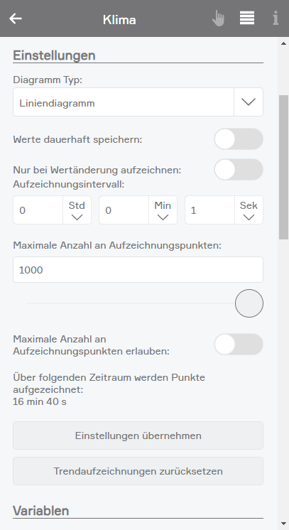 In den Einstellungen können Sie konfigurieren welche Werte aufgezeichnet werden sollen, wie lange diese aufgezeichnet werden sollen und wie diese im Diagramm dargestellt werden sollen.