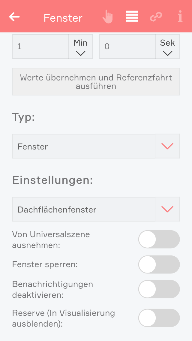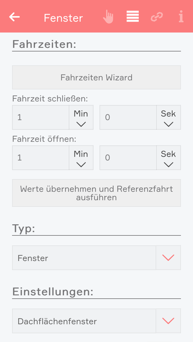 Wenn Sie genau wissen, wie lange Ihr Fenster beim Öffnen und Schließen benötigt, können Sie die Zeiten direkt bei “Fahrzeit schließen” und “Fahrzeit öffnen” eintragen und danach den Button “Werte übernehmen und Referenzfahrt übernehmen” klicken.