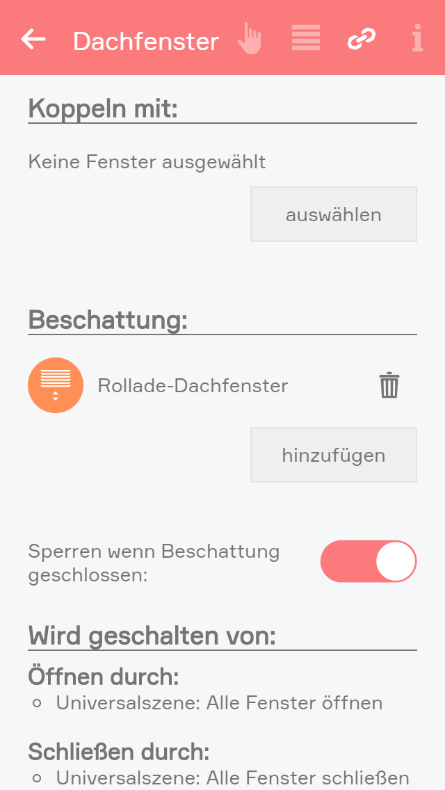 Zudem ist es möglich, dass ein Fenster automatisch gesperrt wird, sobald eine ausgewählte Beschattung teilweise bis ganz geschlossen ist. Sobald die Beschattung wieder vollständig offen ist oder diese Option deaktiviert wurde, kann das Fenster wieder bedient werden.