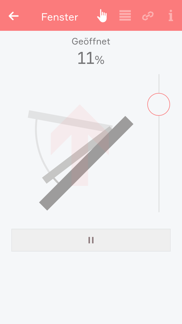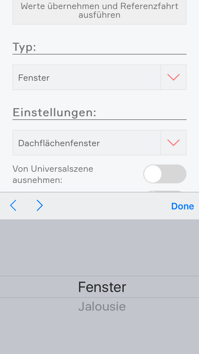 Um ein elektrisches Fenster anzulegen, öffnen Sie die App “Beschattung” und wählen dort die Jalousie aus, an der das elektrische Fenster angeschlossen ist. Danach navigieren Sie ins Parameterpanel und dort wählen Sie bei “Typ” “Fenster” aus.