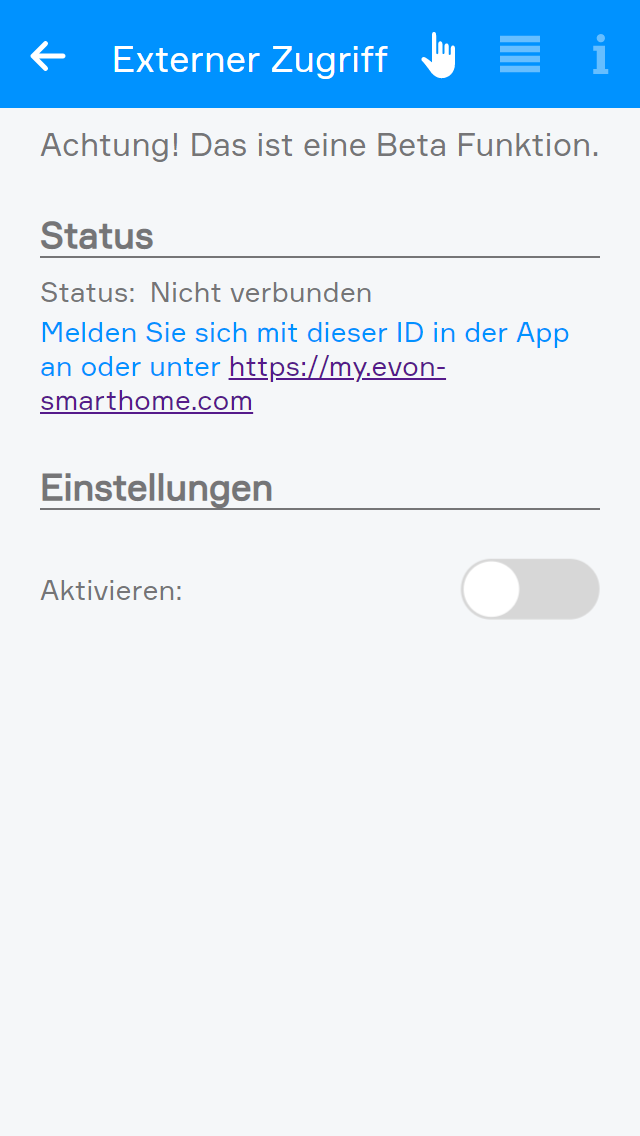 Sobald Sie die Funktion aktiviert haben, ändert sich der angezeigte Status von ‘Nicht verbunden’ auf ‘Verbunden’ und es erscheint die ‘evon Smart Home Id’. Diese Id ist notwendig, um Sie mit Ihren evon Smart Home System zu verbinden. Schreiben sie sich am besten auf, denn Sie benötigen sie im nächsten Schritt.