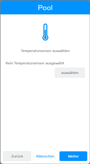 Start des Wärmepumpen-Wizards nachdem Wärempumpe im Pool-Wizard ausgewählt wurde. In diesem Schritt ist die Schnittstelle, an die die Wärempumpe angeschlossen ist, auszuwählen.